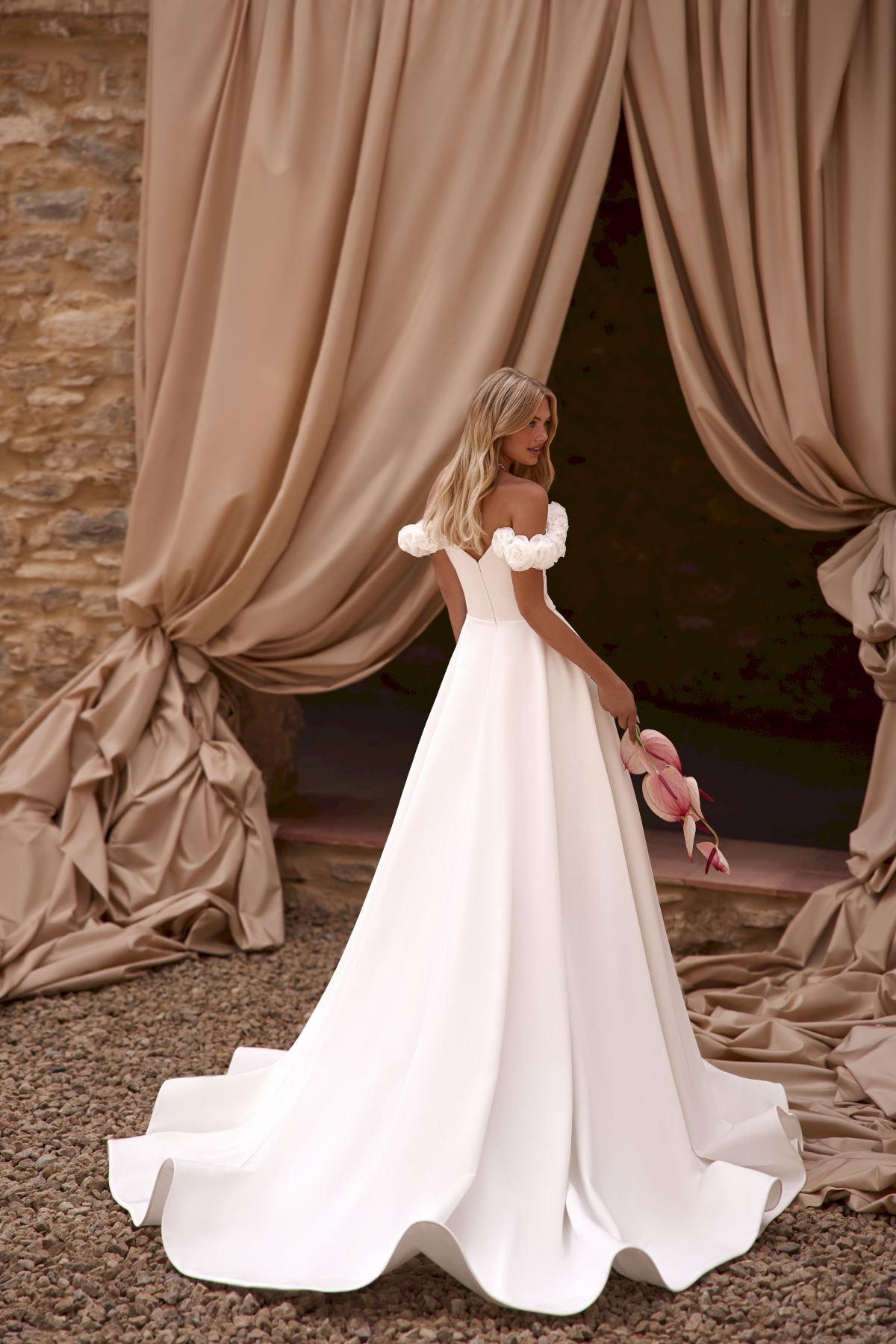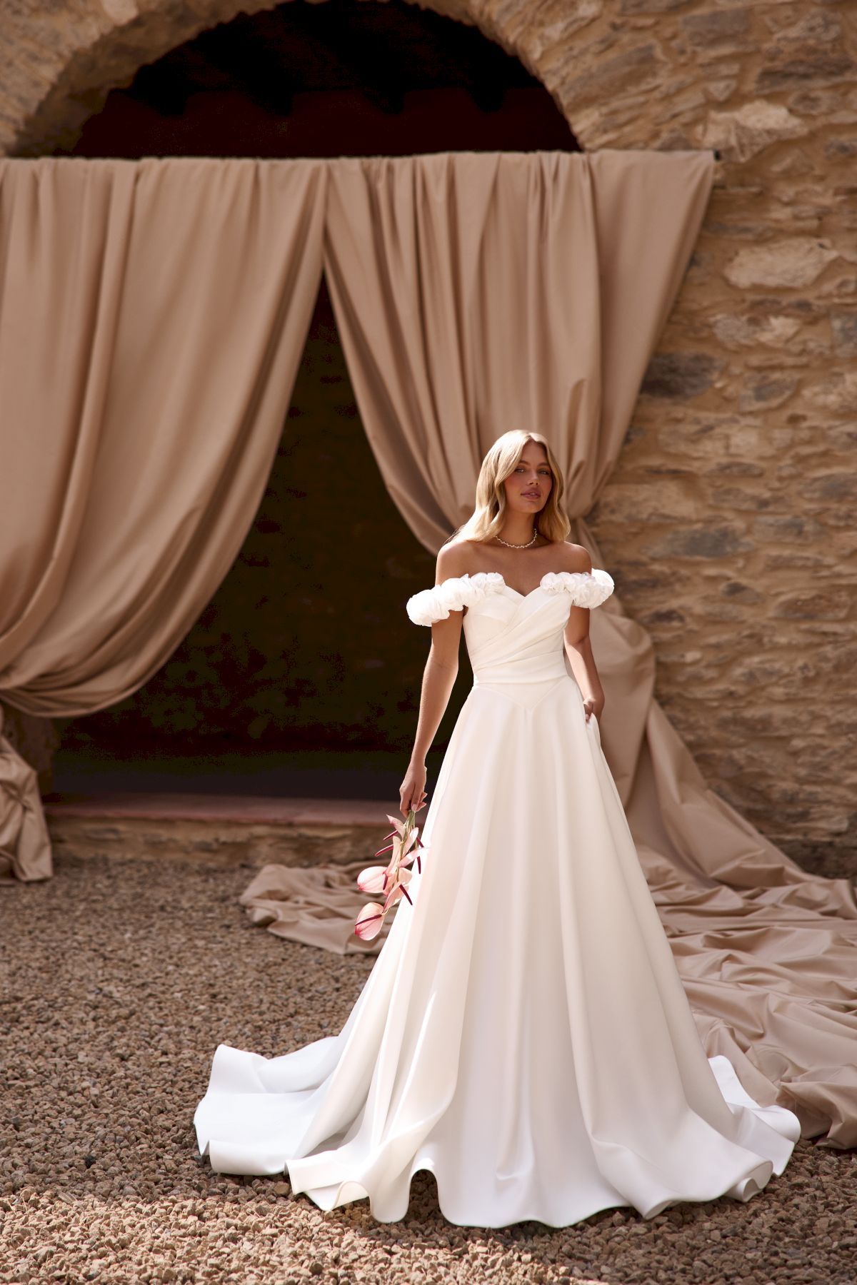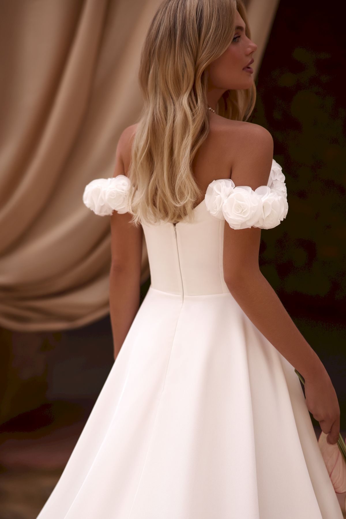 Ein reduziertes aber Detailverliebtes Trägerloses Kleid mit Statement Carmenärmel aus Blüten. Die Seitlichen Carmenträger sind abnehmbar und verwandeln den Look sofort. Das Kleid zaubert eine wundervolle Taille durch die Trapierungen am Bauch und der verlängerten Taille, die Schleppe ist ein schönes Details was den Brautlook perfekt macht.