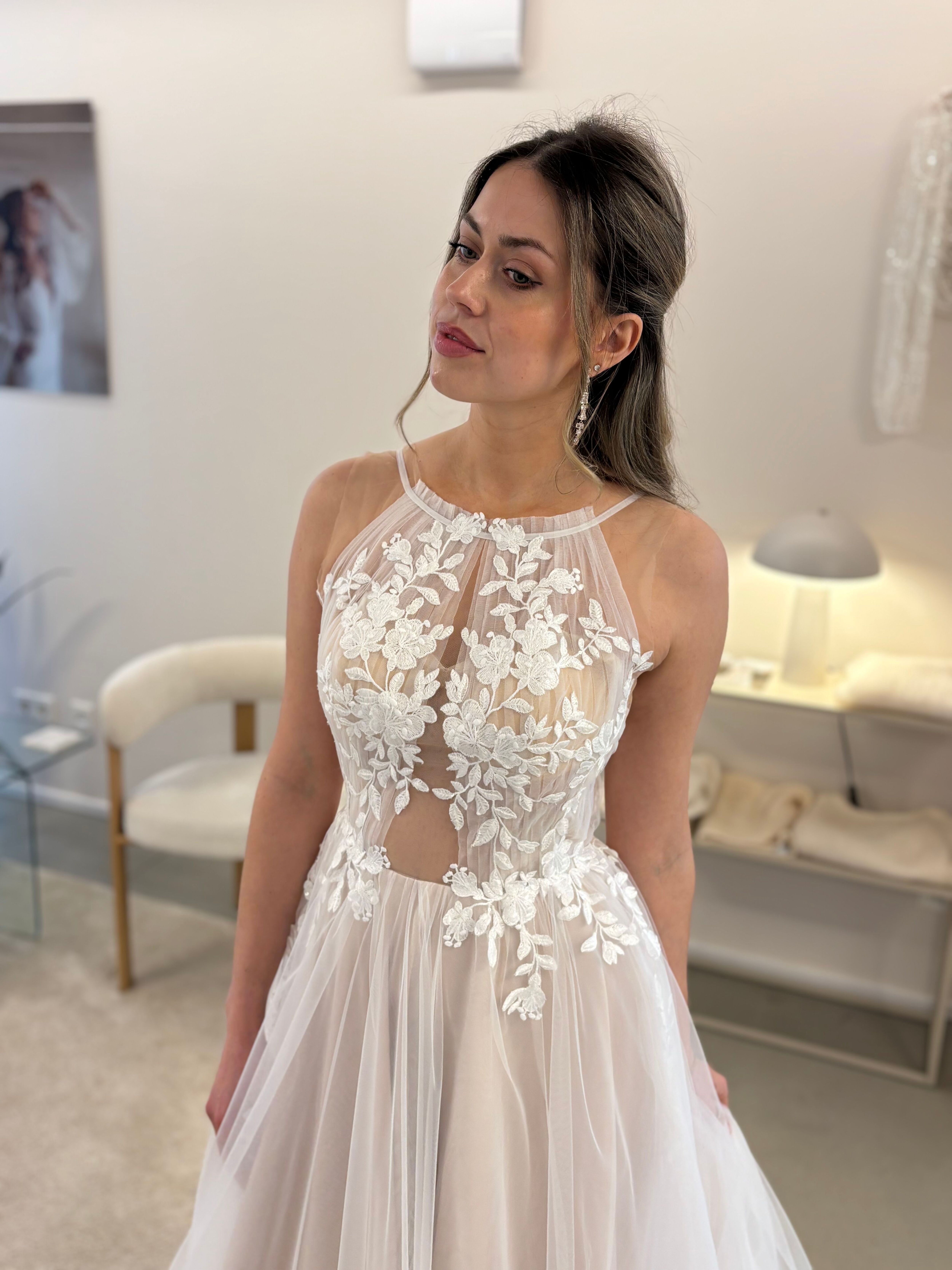 Romantische verspielte, aufregende A-linie mit zartem Neckholder, leichter Transparenz und feiner floraler Spitze. Der weiche blushfarbene Softtüllrock mit Beinschlitz ist ideal wenn du es bequem und leicht magst. Natürlich kannst du das Kleid alternativ auch in ivory bekommen.