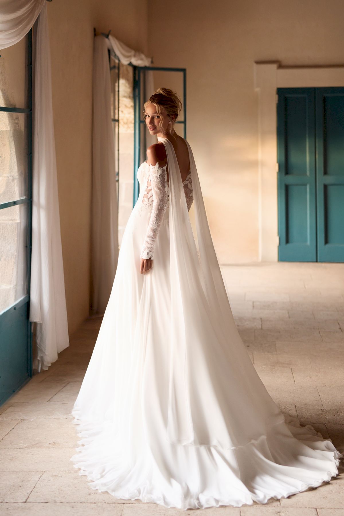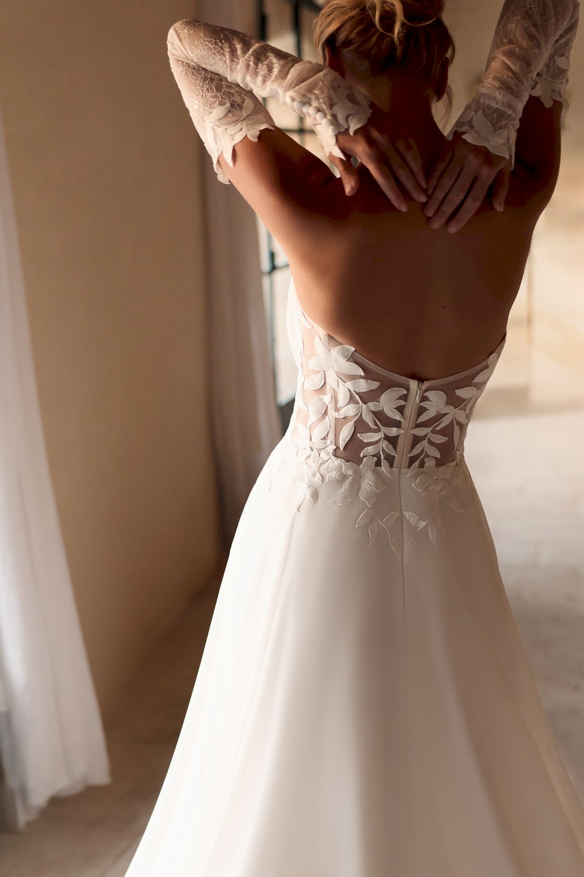 Ein figurformendes Trägerloses Kleid mit Korsage, zarter Spitze einem aufregenden V Ausschnitt und einem transparenten Rücken. Für den persönlichen Look, kannst du den Chiffonschal dazu kombinieren sowie die die passenden Stulpen für die Arme. Das Kleid hat einen saften und fluffig weichen Chiffonrock, alternativ kannst du ihn immer auch mit Schlitz bekommen oder Softtüll anstatt Chiffon wählen.
