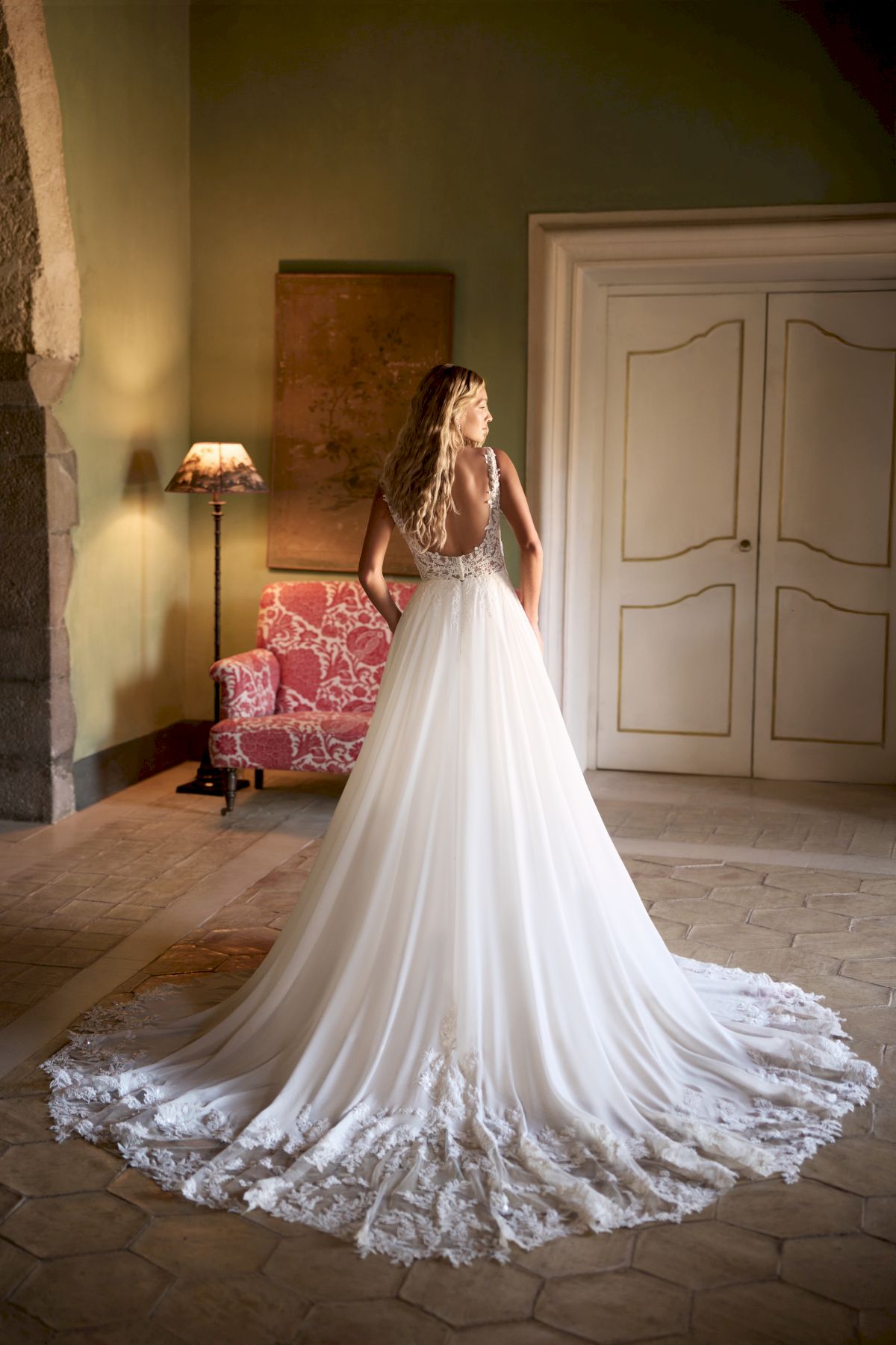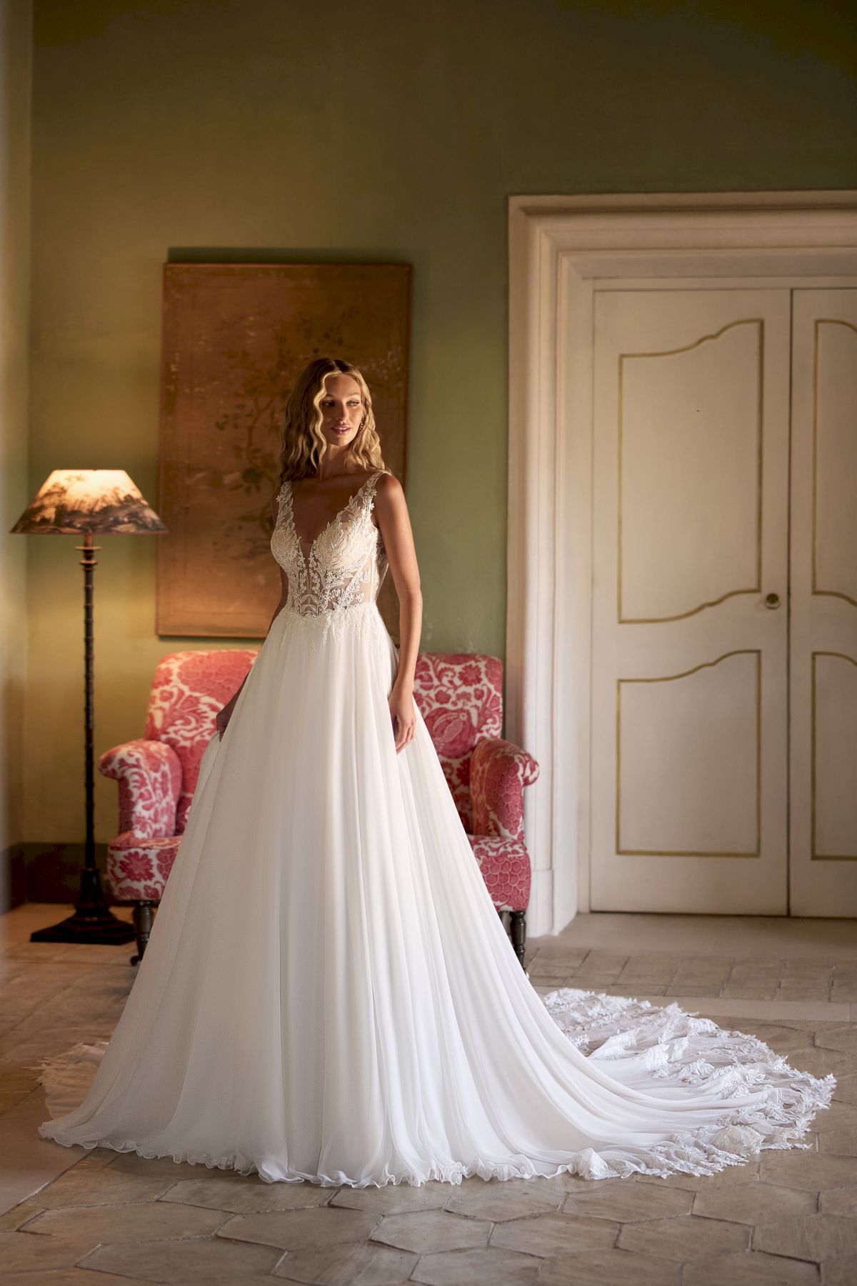 Formende Korsage mit breiteren Trägern für einen super Tragekomfort. Fließender Chiffonrock, Spitze und zarte schimmernde Details.