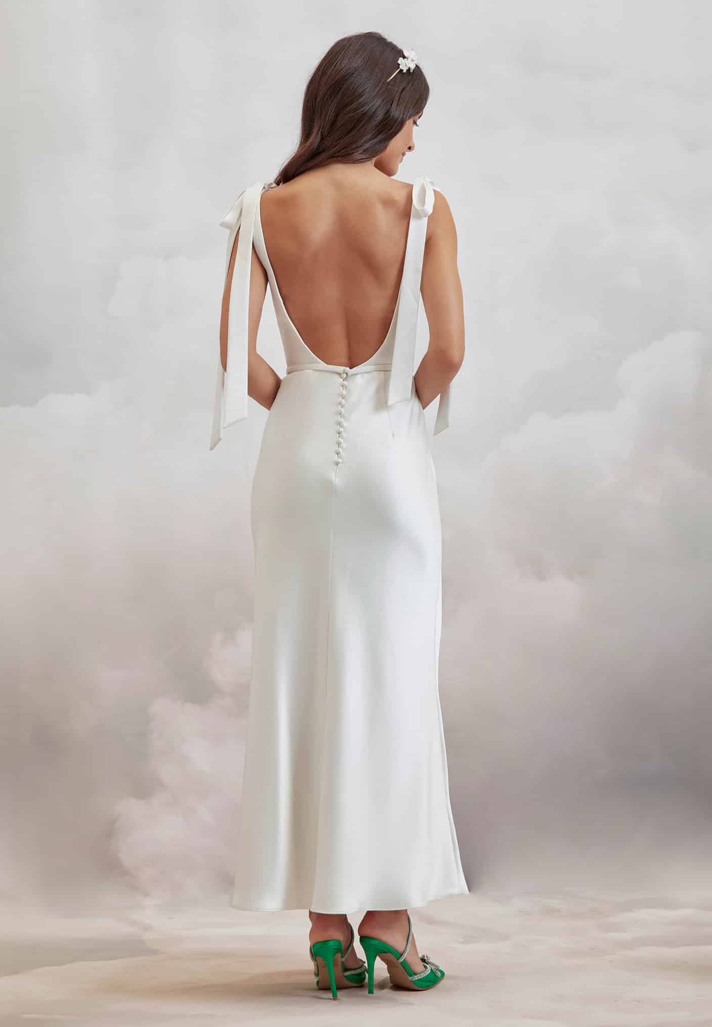 Das knieumspielende Becca-Kleid zeichnet sich durch eine moderne, schräg geschnittene Silhouette aus schwerem Braut-Elfenbein-Satin aus. Der strukturierte, weiche quadratische Ausschnitt wird durch verstellbare Träger gehalten, die zu Schleifen auf den Schultern gebunden werden können. Das Oberteil ist vollständig verstärkt und verfügt über verdeckte Brustcups, die den tief ausgeschnittenen, offenen Rücken sichern. Ein zierlicher, verstärkter Gürtel betont die schmale Taille, während der schräg geschnittene Rock sanft über die Hüften fällt und bis zum Knöchel reicht. Mit Satin überzogene Knöpfe und ein unsichtbarer Reißverschluss im Rücken öffnen dieses besondere Kleid für dein Standesamtauftritt oder deine Party am Abend.