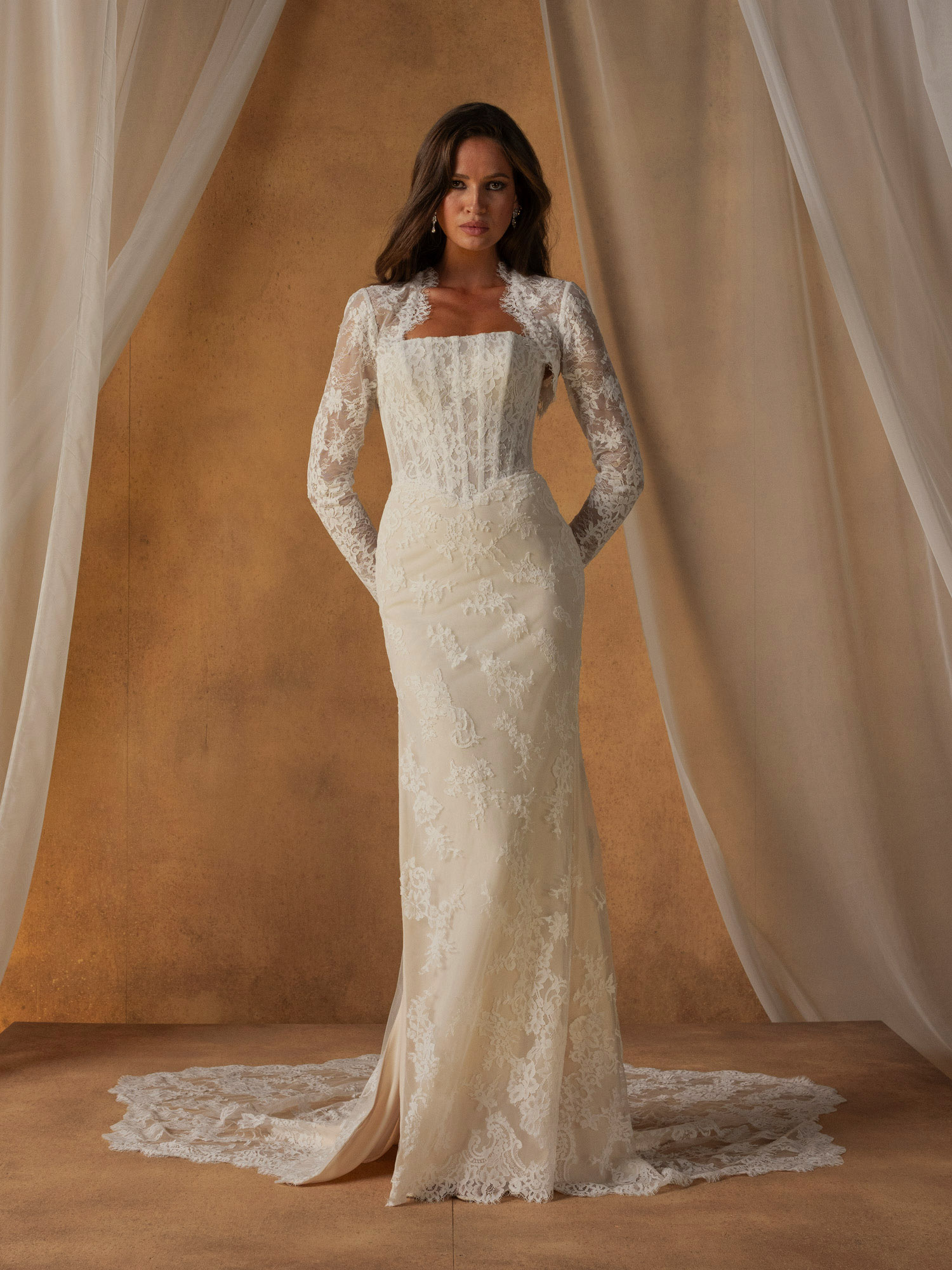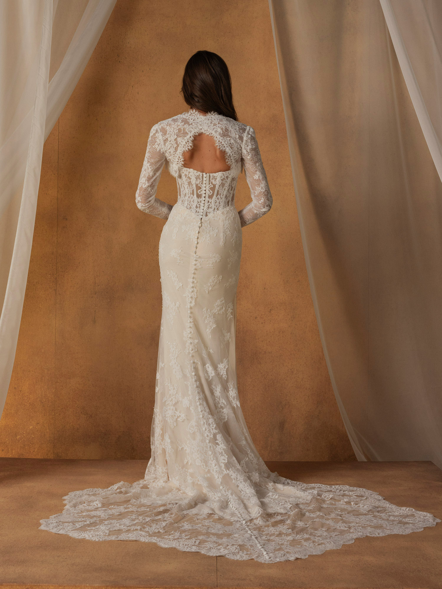 Hinter dem Kleid fällt eine dramatische Schleppe aus Chantilly-Spitze herab, die mit einem geschwungenen Saum abschließt, der die Textur und den Vintage-inspirierten Charme unterstreicht.