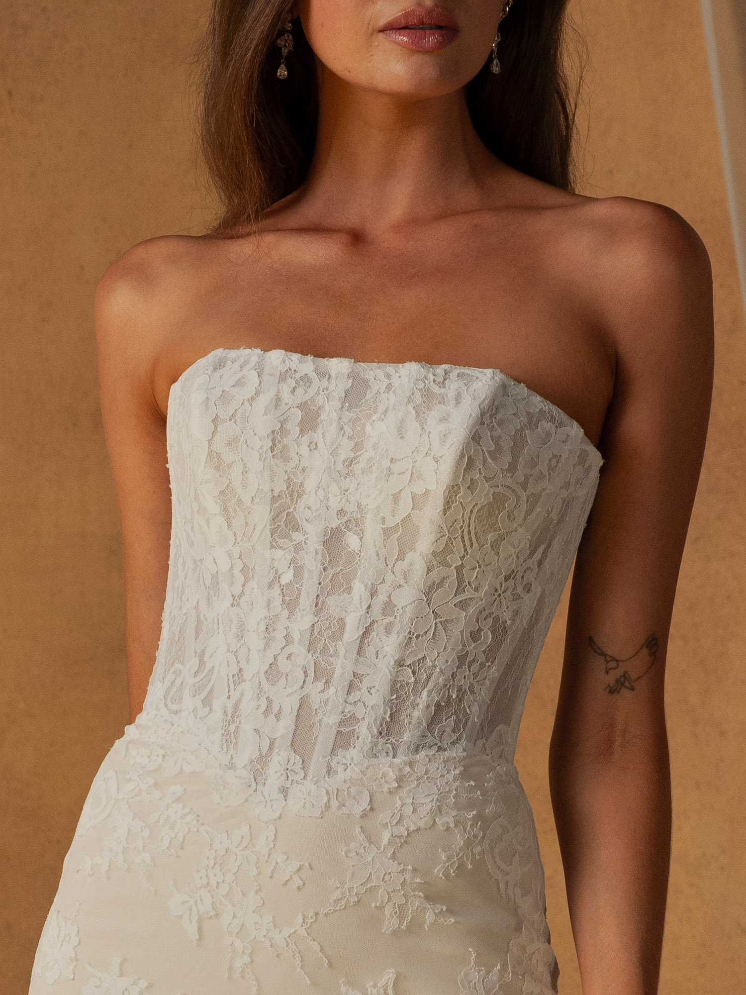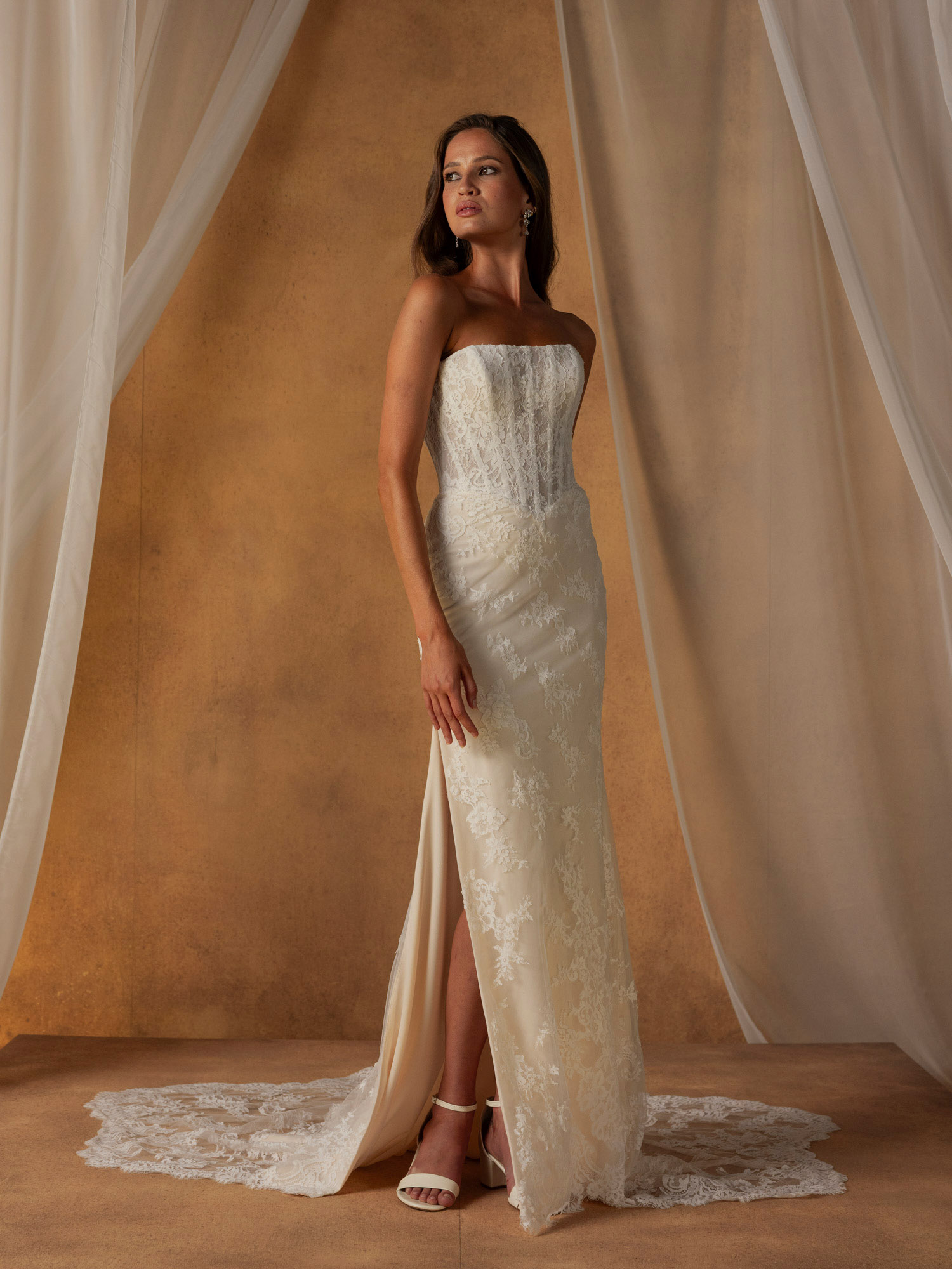 Ein gerader, trägerloser Ausschnitt geht in ein transparentes Oberteil über, dessen Form durch sichtbare Stäbchen unter raffiniert platzierter Spitze betont wird. Die baskische Taille schmiegt sich an die Figur und geht in einen schmalen Rock mit einem dezenten Seitenschlitz über, der für subtile Bewegungsfreiheit sorgt.