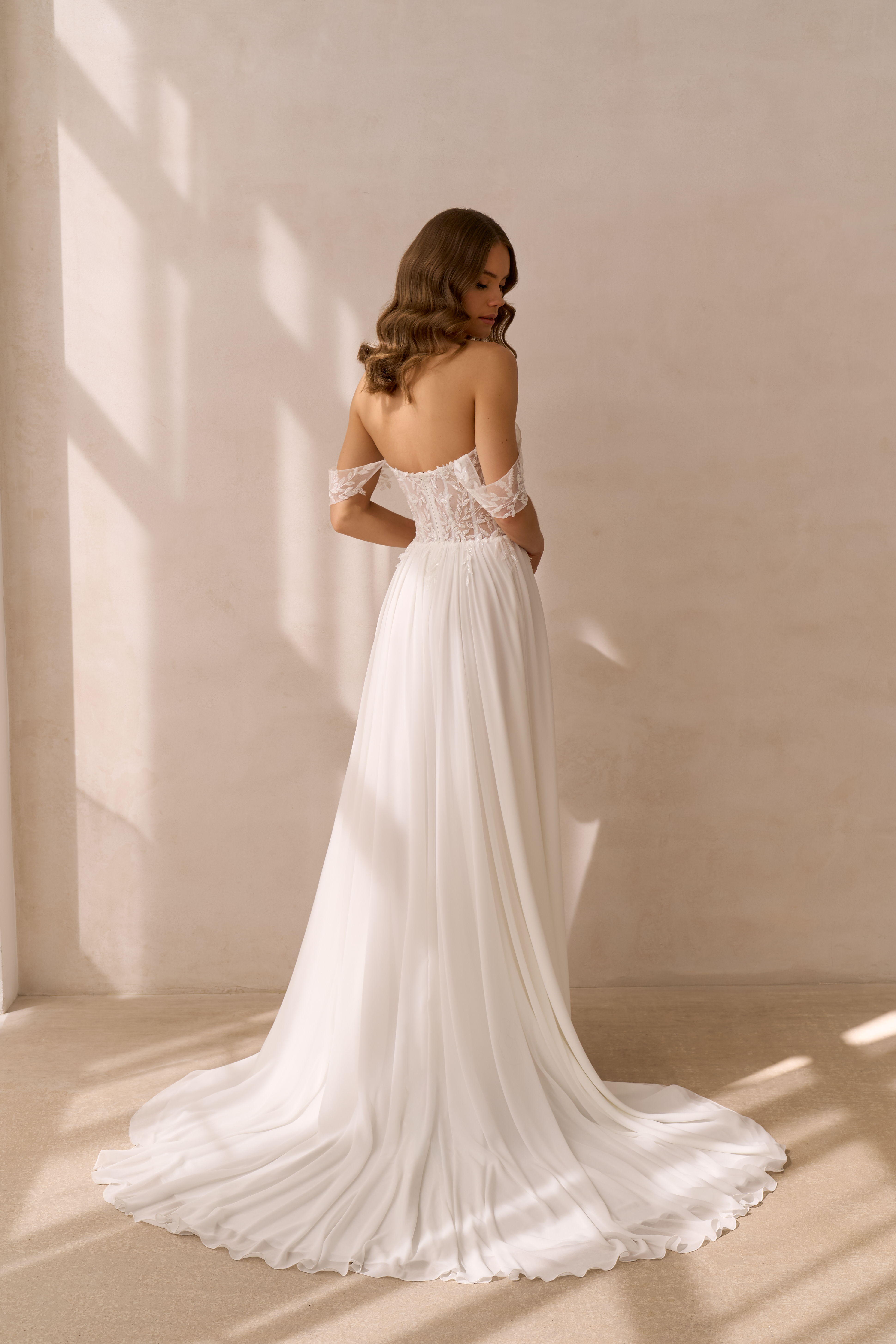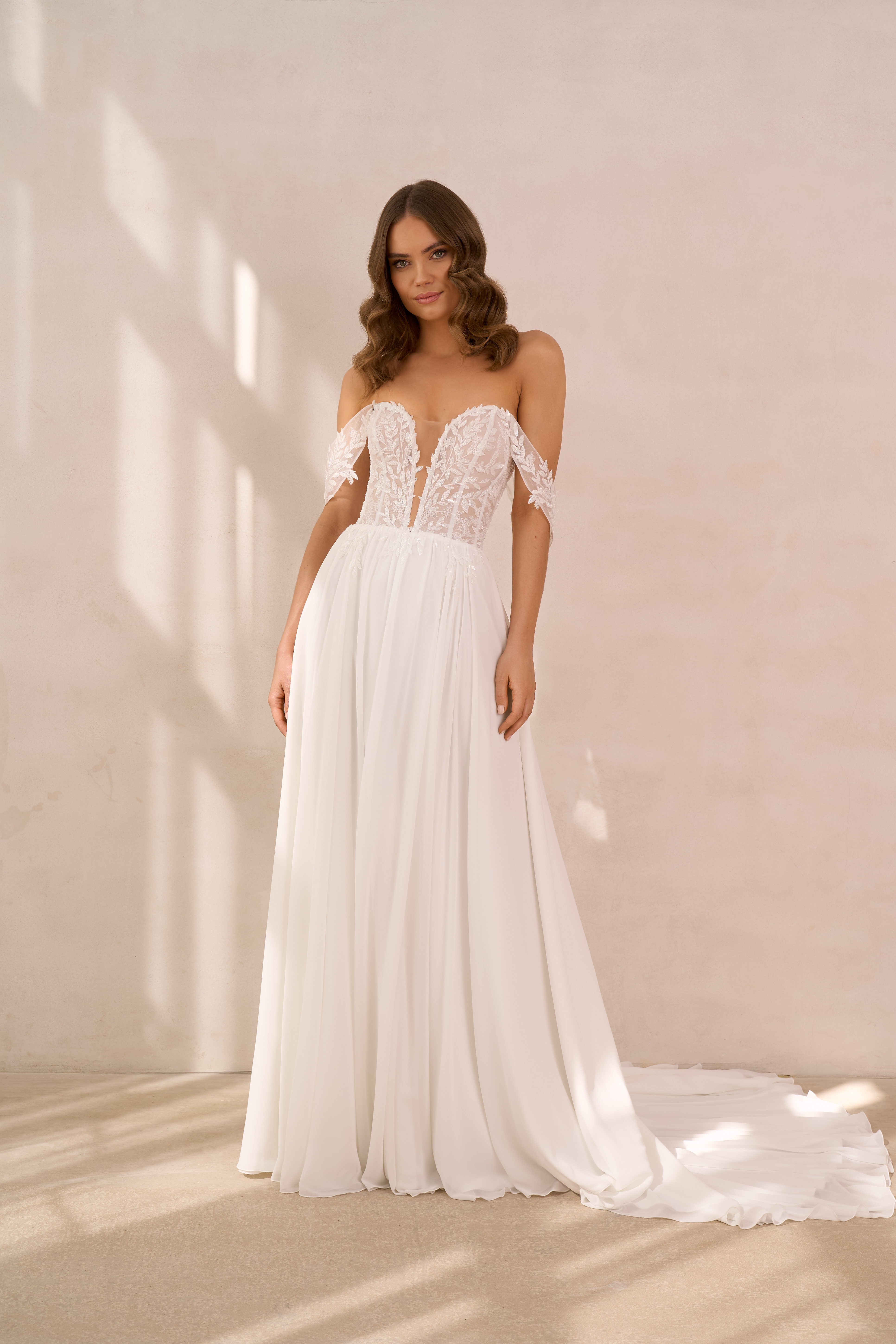 Ein zartes Trägerloses Chiffonkleid, mit Spitze besetzten Carmenträgern, tiefem Ausschnitt, zarter Blätterspitze, einer leichten Korsage für einen guten aber bequemen halt.