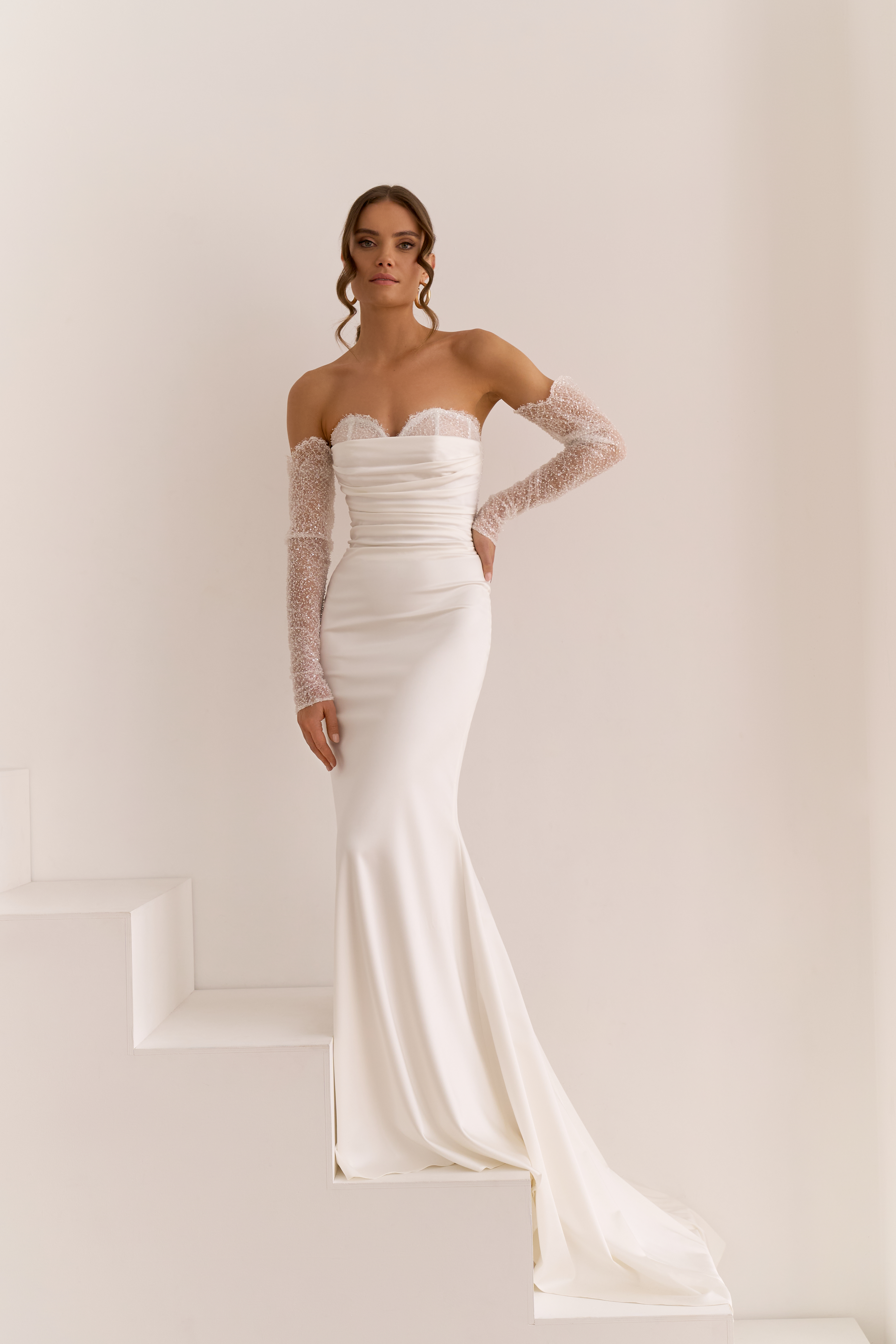 Ein Figurbetontes fit & flare Kleid, Spitzendetails und modernen Drapierungen an Dekolleté und leichter Schleppe. Für ein weiteres Highlight sorgen die Spitzenärmel
