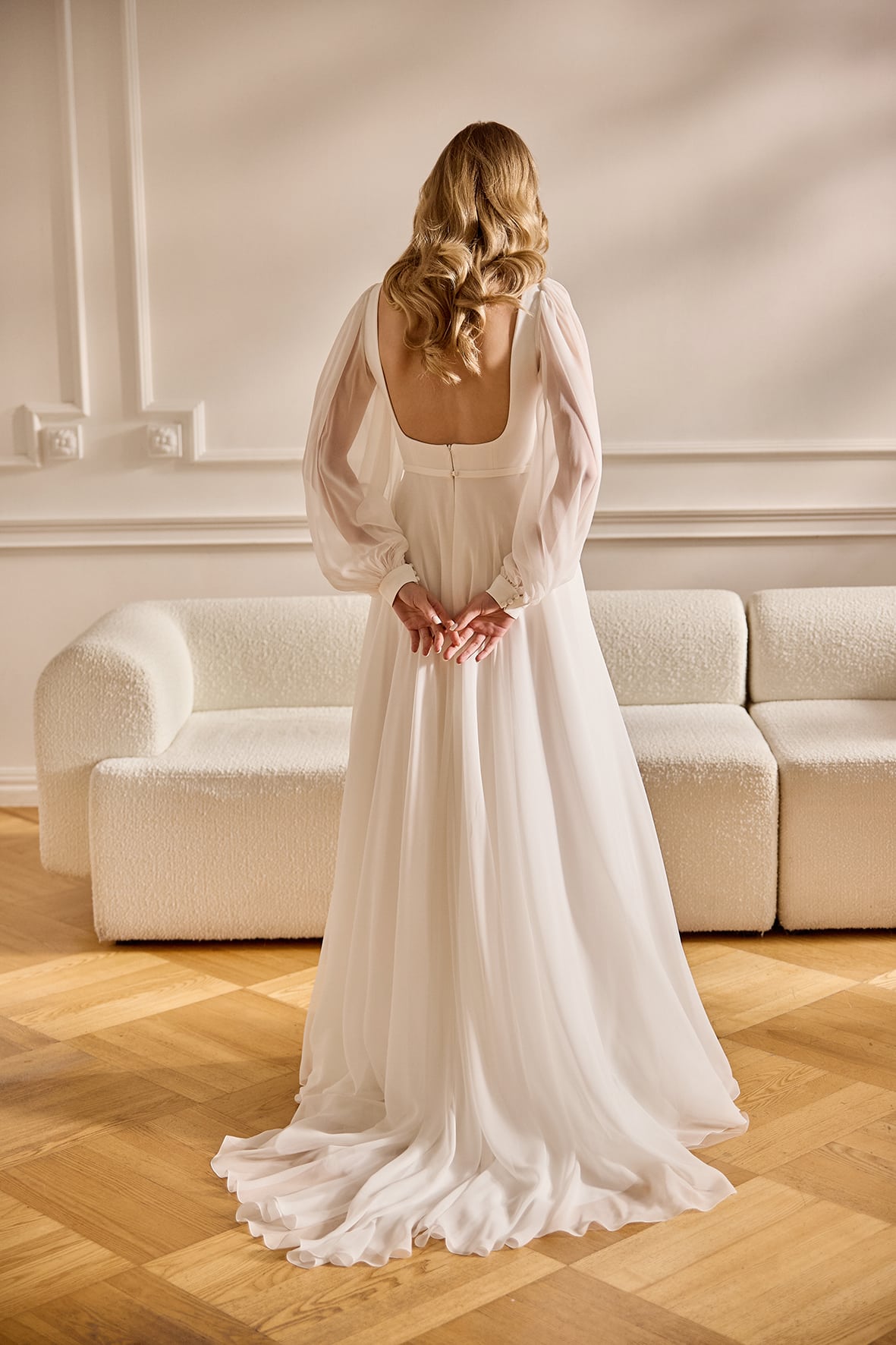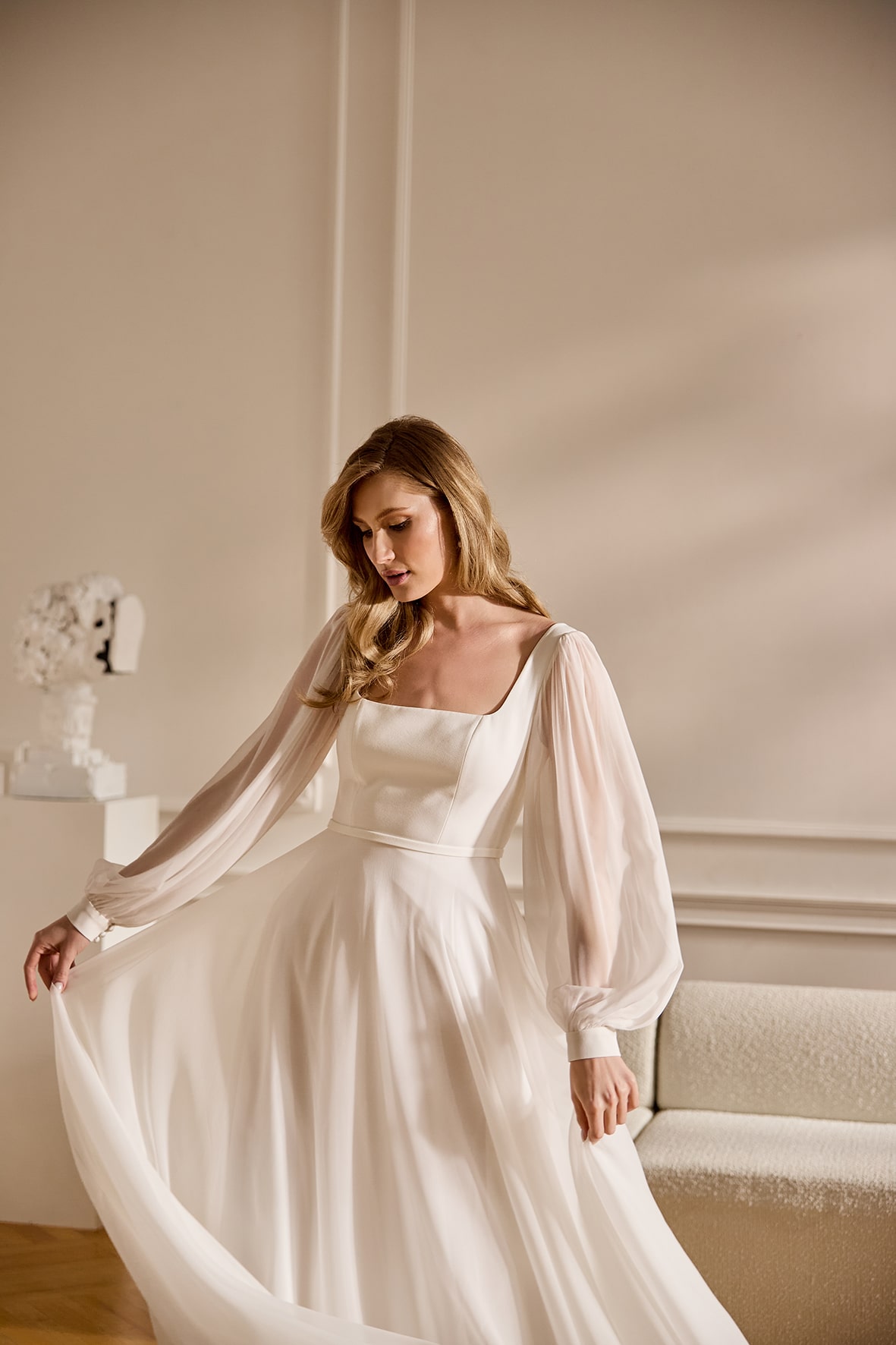 eine leichte A-Linie mit dem angesagten eckigen Ausschnitt, breiteren Trägern und einem zarten Seidenrock. Modern, zart und leicht. Unser Modell im Store hat keine Ballonärmel, die können jederziet für dich mitbestellt werden.
